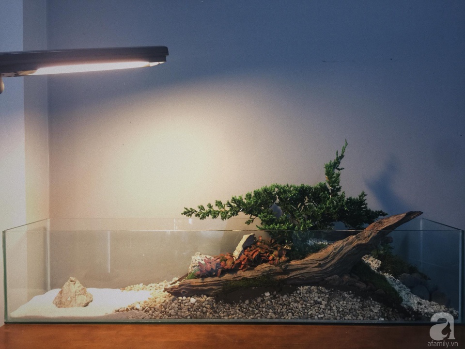 - Từ bé mình đã thích động vật, cây cối rồi, nhưng hồi bé thì mẹ không cho nuôi hay trồng cây vì mình thường thích cái gì là hay bưng vào phòng để lúc nào cũng được ngắm nên làm phòng bừa bộn suốt. Ý tưởng làm tiểu cảnh thì bắt đầu từ việc em muốn mang một phần không khí thiên nhiên vào không gian làm việc thường chỉ có máy tính.