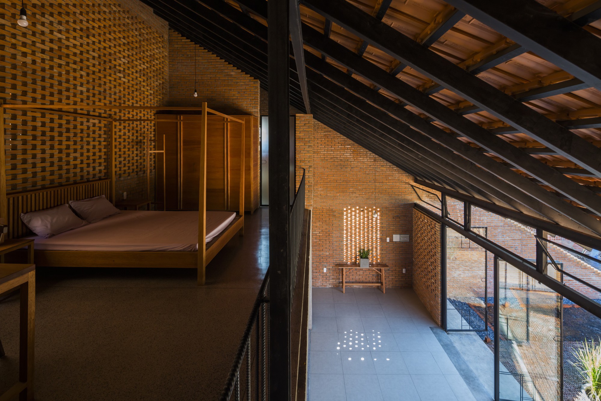 Lối lên tầng lầu trong ngôi nhà này rất gọn gàng. Nếu tầng trệt mà không gian sinh hoạt chung rộng thoáng thì không gian nghỉ ngơi được đưa hết lên tầng lầu với thiết kế mộc mạc. Với những mảng tường thông gió được tính toán từ đầu, khi mặt trời lên, các căn phòng sẽ ngập tràn ánh sáng mà không cần sự hỗ trợ của đèn điện.
