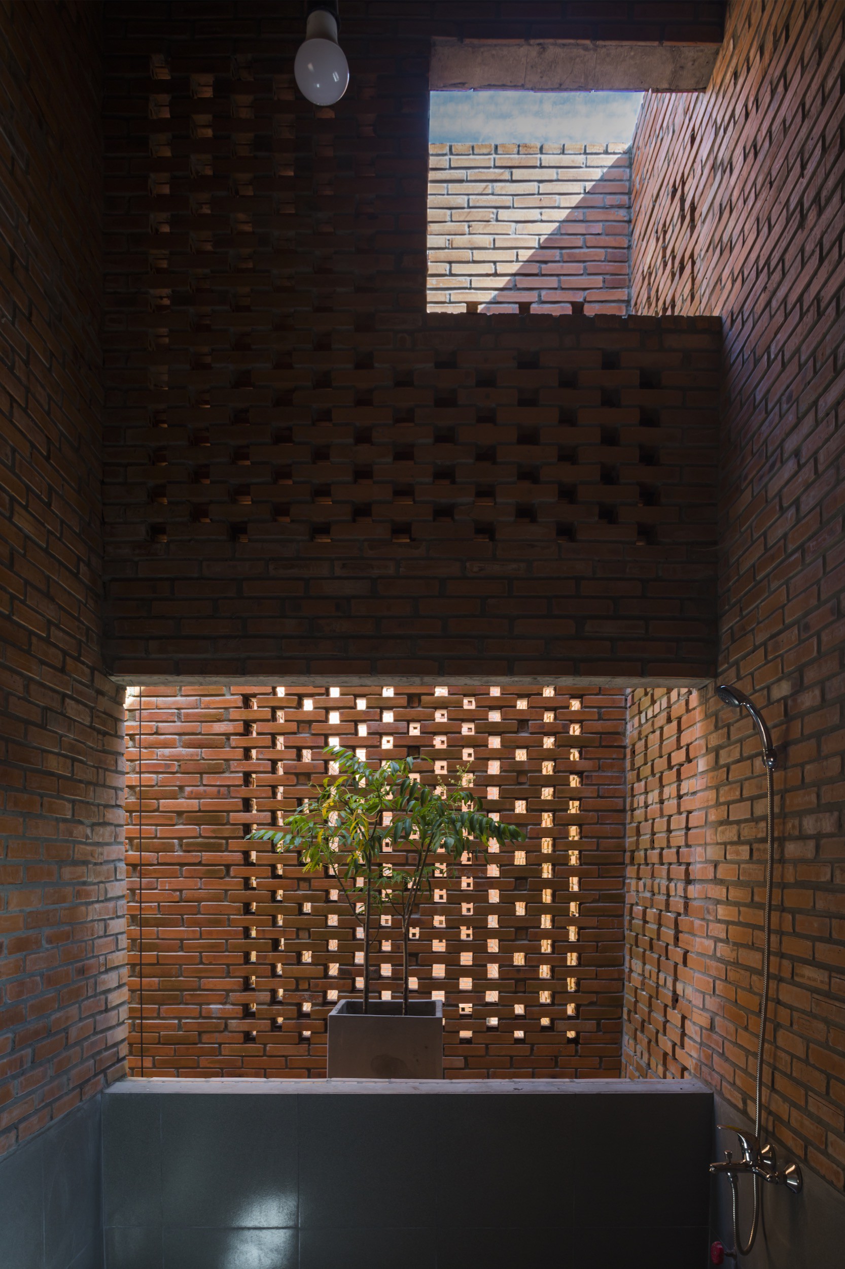 Các không gian nhìn từ mặt tiền. Mặt tiền ngôi nhà được xây bằng gạch lỗ để phù hợp với khí hậu nắng lắm, mưa nhiều của vùng nhiệt đới.