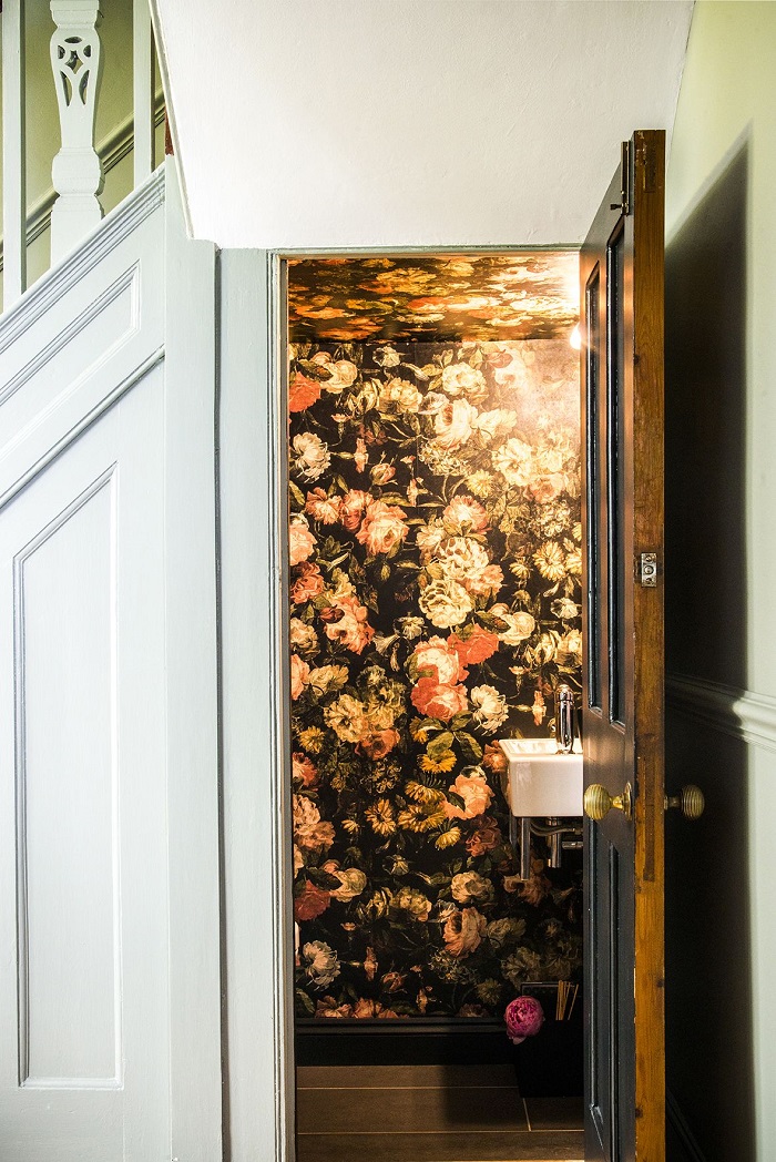 Hình dán bằng hoa là một xu hướng trong trang trí nhà vệ sinh. Bạn hãy kết hợp thêm bồn rửa cổ điển và bàn gỗ.