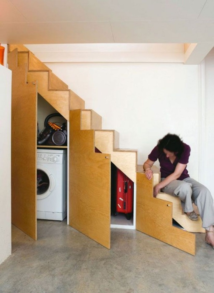 Một không gian trống dưới cầu thang có rất nhiều khả năng tận dụng để biến thành một căn phòng mới. Nó có thể là một nơi làm việc, một không gian vui chơi cho trẻ em, tủ quần áo, hầm rượu, thư viện và nhiều hơn nữa. Nó cũng có thể là phòng ngủ rất hữu ích nếu bạn thường xuyên có khách. Đối với máy giặt thường không có đủ không gian riêng biệt thì đặt dưới gầm cầu thang là đúng những gì bạn cần.