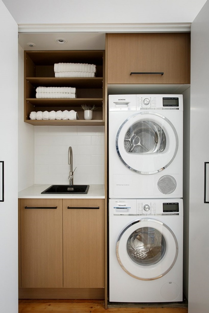 Nếu có một chiều dài đủ thì bạn sẽ thoải mái đặt chồng hai máy giặt và sấy lên nhau mà vẫn thừa diện tích cho bồn rửa tay đấy.